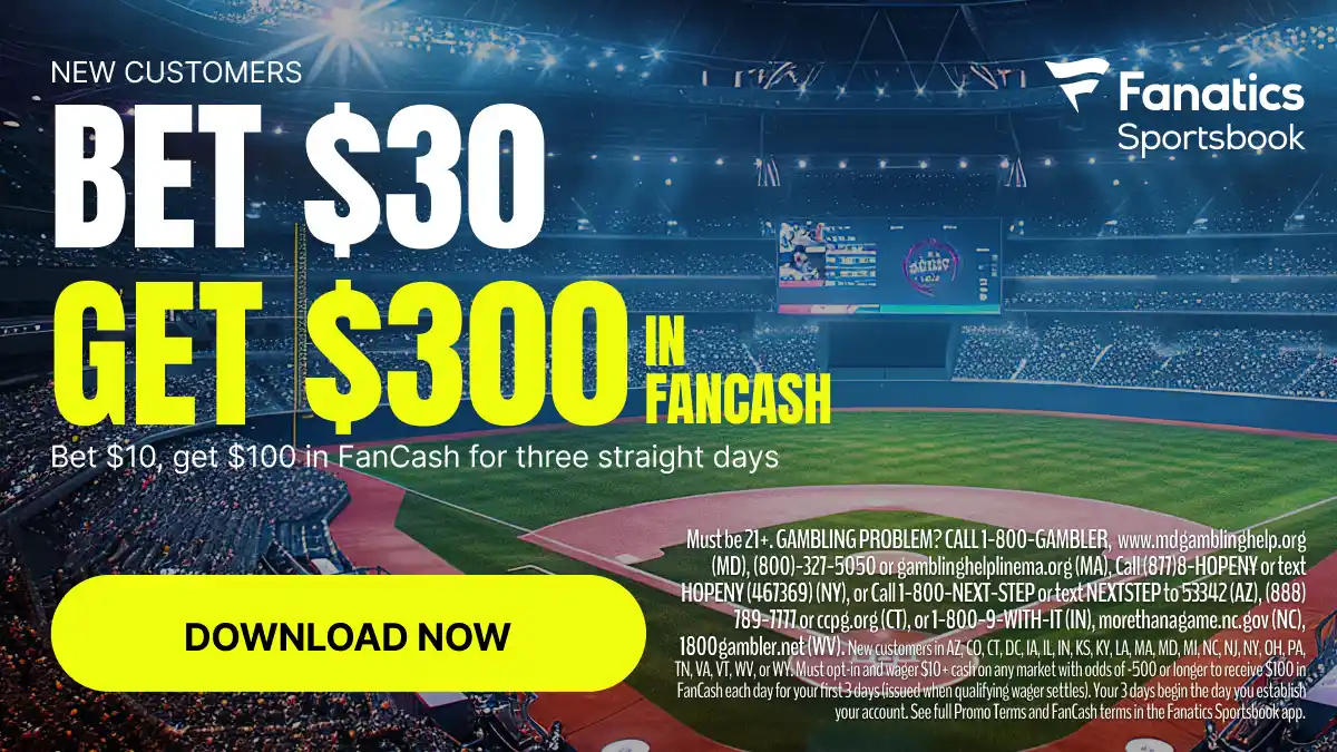 New customers in AZ, CO, CT, DC, IA, IL, IN, KS, KY, LA, MA, MD, MI, NC, NJ, NY, OH, PA, TN, VA, VT, WV, or WY. Must opt-in and wager $10+ cash on any market with odds of -500 or longer each day to receive $100 in FanCash each day for your first 3 days (issued when qualifying wager settles). Your 3 days begin the day you establish your account. See full Promo Terms and FanCash terms in the Fanatics Sportsbook app. FanCash amounts are non-withdrawable and cannot be redeemed for cash.