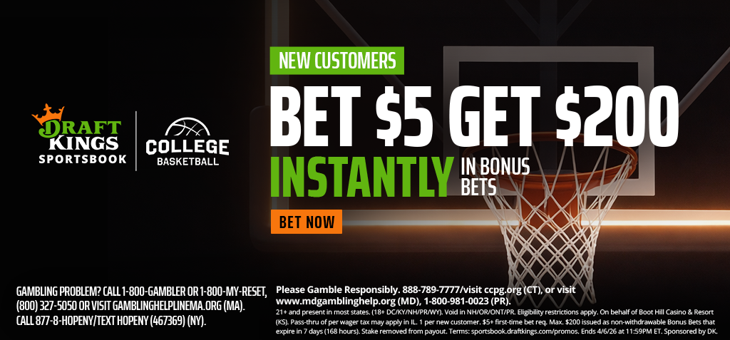 GAMBLING PROBLEM? CALL 1-800-GAMBLER or 1-800-MY-RESET, (800) 327-5050 or visit gamblinghelplinema.org (MA). Call 877-8-HOPENY/text HOPENY (467369) (NY). Please Gamble Responsibly. 888-789-7777/visit ccpg.org (CT), or visit www.mdgamblinghelp.org (MD), 1-800-981-0023 (PR). 21+ and present in AZ, CO, CT, DC, IA, IL, IN, KS, KY, LA (select parishes), MA, MD, ME, MI, MO, NC, NJ, NY, OH, PA, TN, VA, VT, WY or WV. (18+ DC/KY/NH/PR/WY). Void in NH/OR/ONT/PR and where prohibited. Eligibility restrictions apply. On behalf of Boot Hill Casino (KS). Pass-thru of per wager tax may apply in IL. 1 per new customer. Min. $5 first-time bet req. Max. $200 issued as non-withdrawable Bonus Bets that expire in 7 days (168 hours) from credit. Stake removed from payout. Plus, upon qualifying bet placement, get 1 100% Profit Boost Token, valid only for a NCAA Tournament Winner bet. Max. Bet: $10. Profit Boost Tokens are single-use and expire on 4/6/26 at 11:59 PM ET. Must select Token BEFORE placing bet. Boost only applies to winnings. Ends 4/6/26 11:59 PM ET. Terms: https://sportsbook.draftkings.com/promos.
